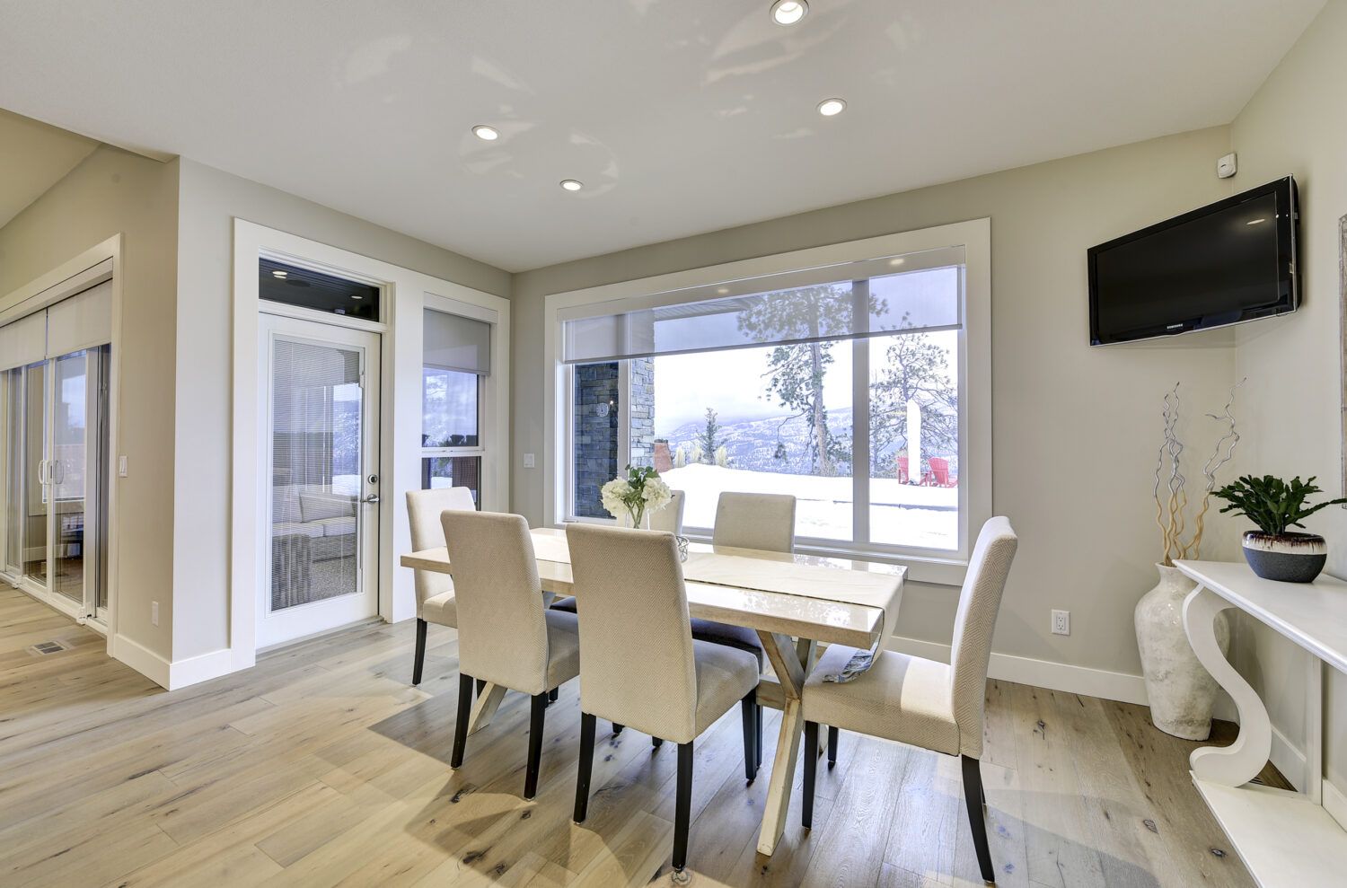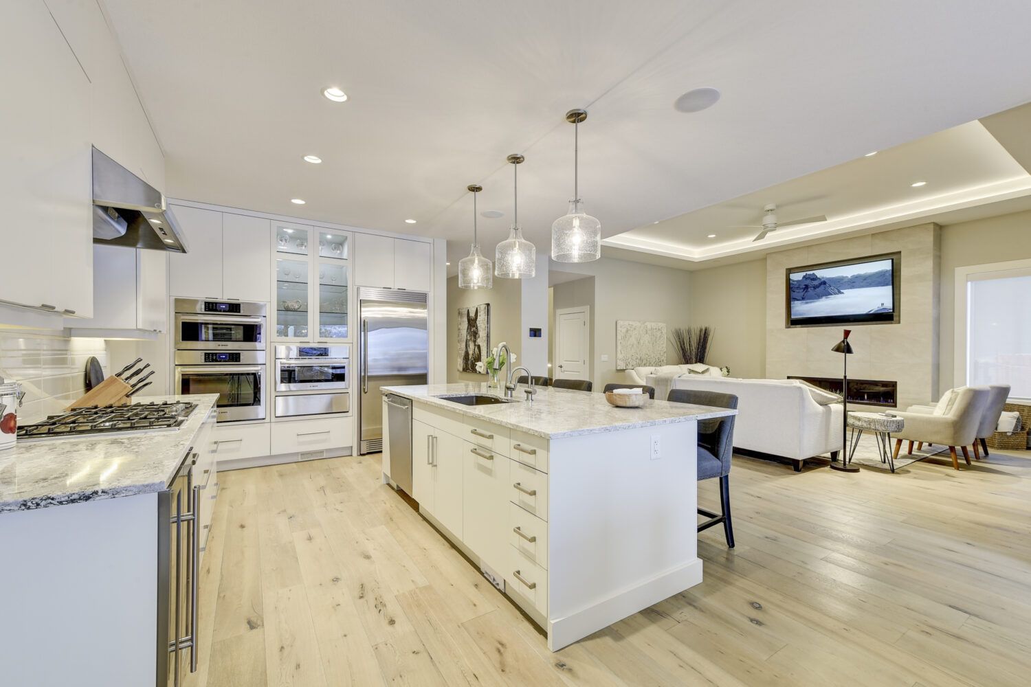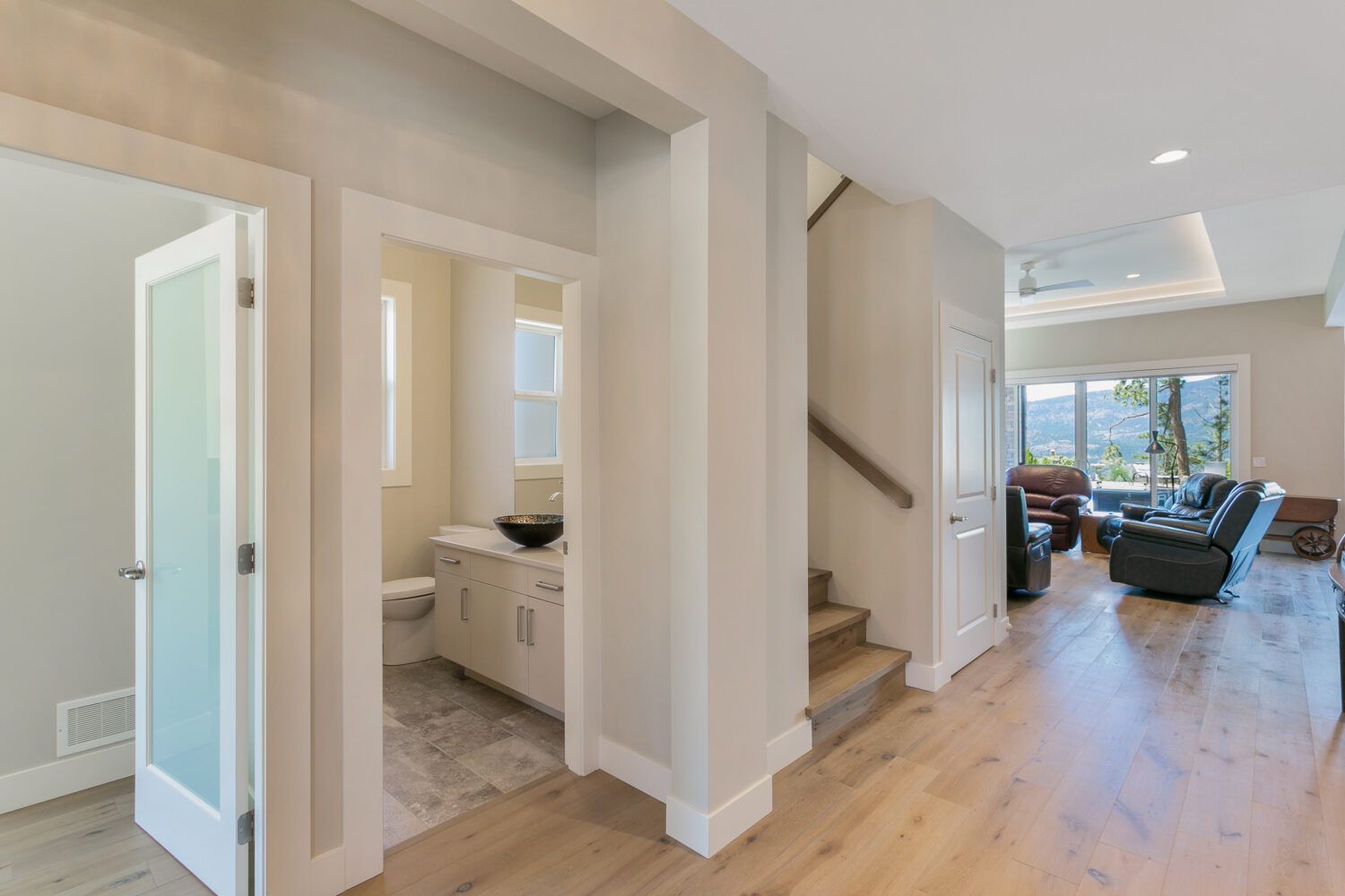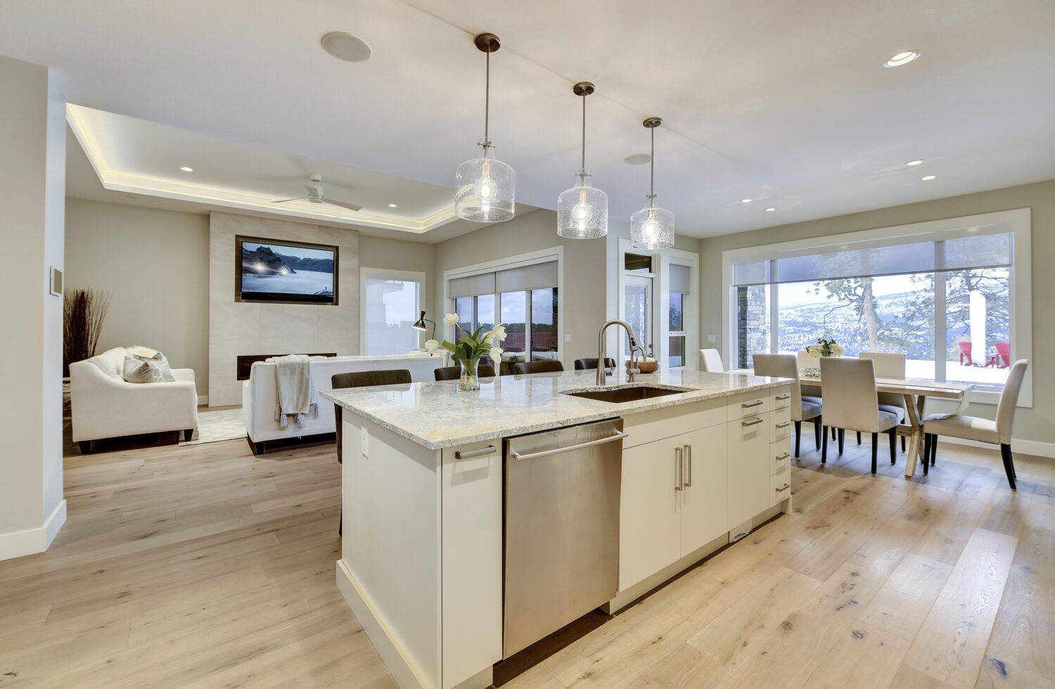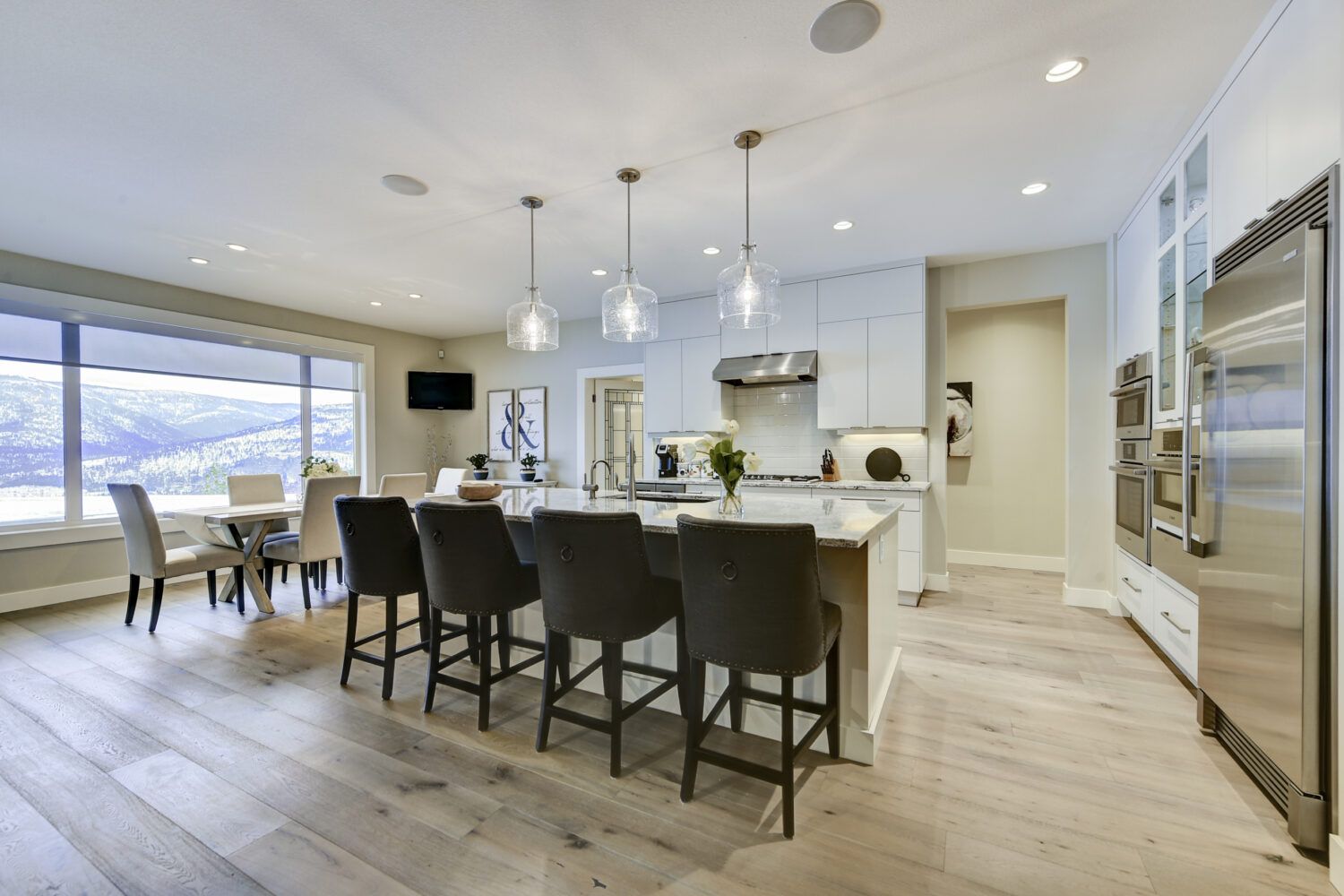 This luxury home’s bright open-concept interior provides ample natural light through the large windows and patio doors, with modern finishings and impressive back-lit tray ceilings. The main floor does not disappoint with its thought-through layout, 2 bedrooms, and 3 bathrooms. The kitchen is large and open, with white cabinetry, top-of-the-line stainless steel appliances, and beautiful quartz countertops. Through the kitchen is a conveniently designed space comprised of a large butler pantry, mudroom, laundry room, bathroom, and master suite. One of the bathrooms on this floor can be accessed directly from the patio and pool. The master suite boasts stunning views, a walk-in closet, and an impressive 5-piece ensuite. Enjoy the amazing views from your kitchen, dining room, and living room with direct access to the patio.