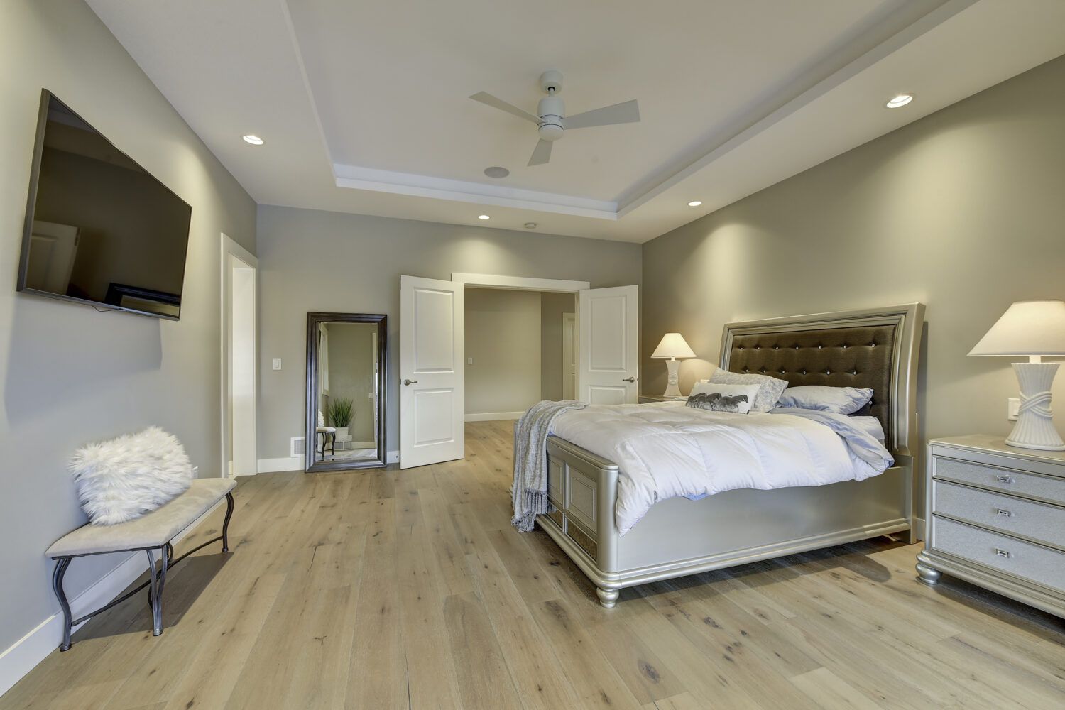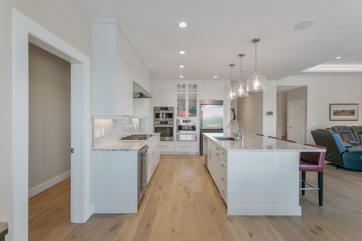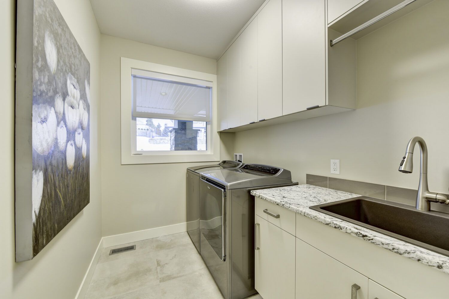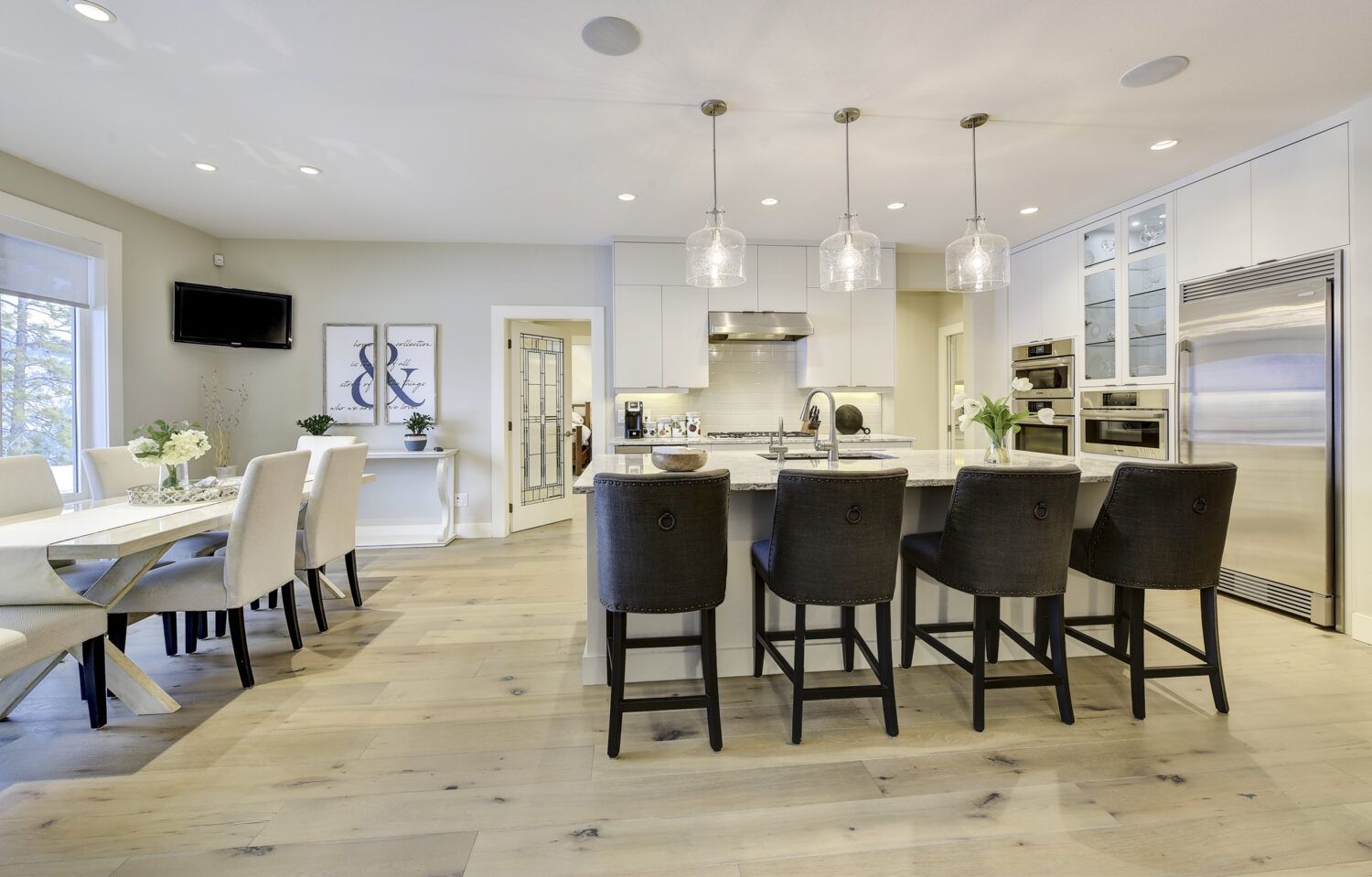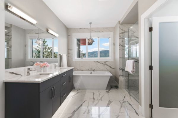 This luxury home’s bright open-concept interior provides ample natural light through the large windows and patio doors, with modern finishings and impressive back-lit tray ceilings. The main floor does not disappoint with its thought-through layout, 2 bedrooms, and 3 bathrooms. The kitchen is large and open, with white cabinetry, top-of-the-line stainless steel appliances, and beautiful quartz countertops. Through the kitchen is a conveniently designed space comprised of a large butler pantry, mudroom, laundry room, bathroom, and master suite. One of the bathrooms on this floor can be accessed directly from the patio and pool. The master suite boasts stunning views, a walk-in closet, and an impressive 5-piece ensuite. Enjoy the amazing views from your kitchen, dining room, and living room with direct access to the patio.