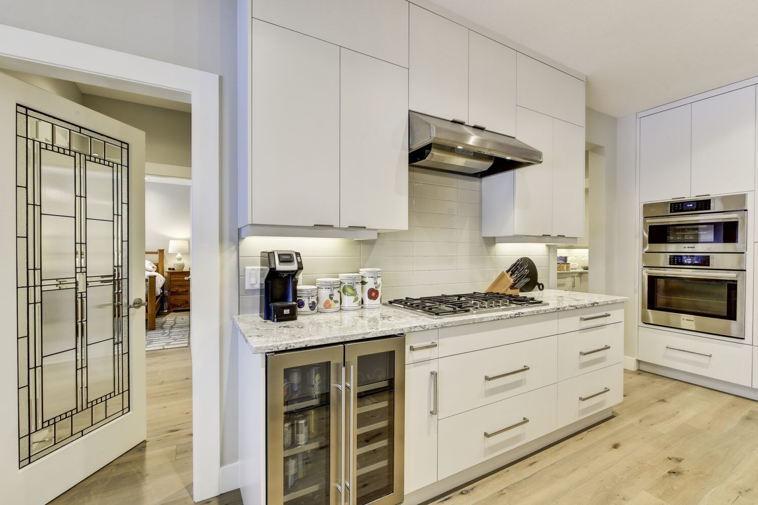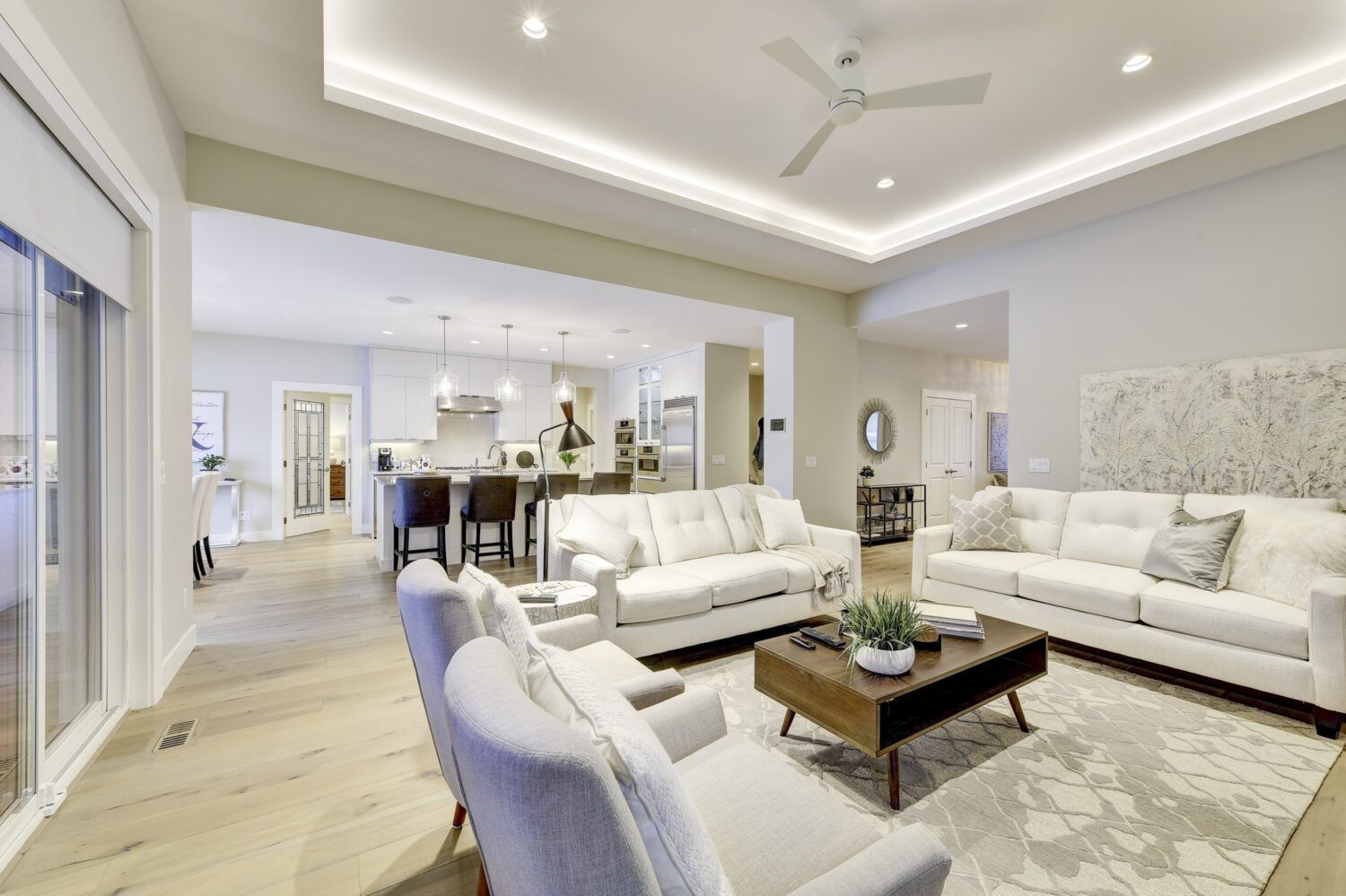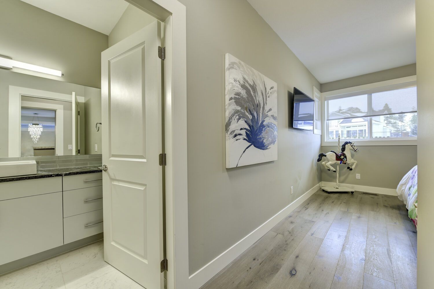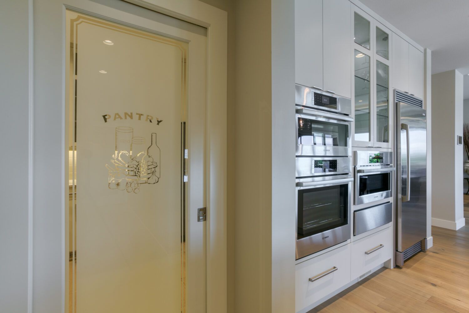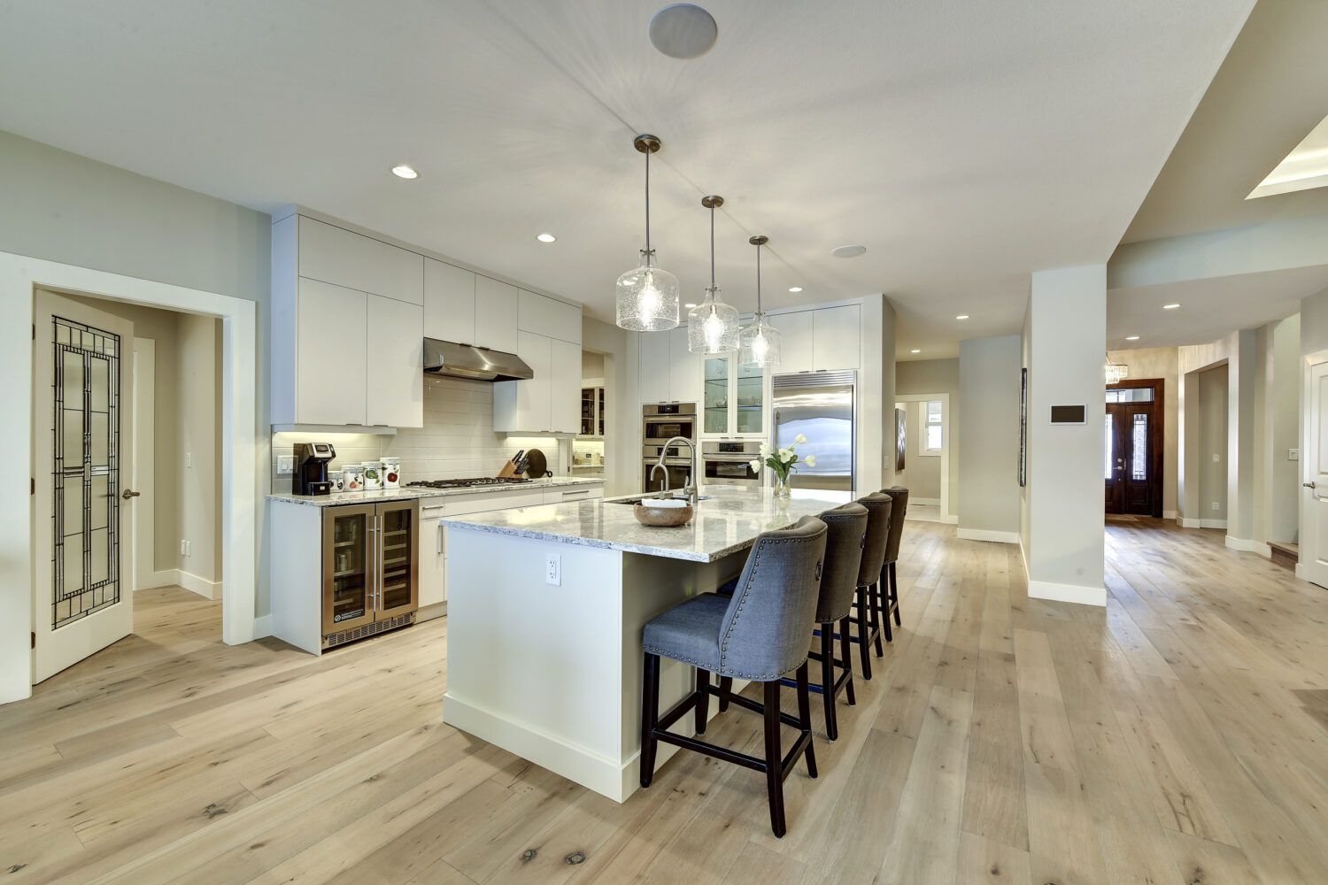 This luxury home’s bright open-concept interior provides ample natural light through the large windows and patio doors, with modern finishings and impressive back-lit tray ceilings. The main floor does not disappoint with its thought-through layout, 2 bedrooms, and 3 bathrooms. The kitchen is large and open, with white cabinetry, top-of-the-line stainless steel appliances, and beautiful quartz countertops. Through the kitchen is a conveniently designed space comprised of a large butler pantry, mudroom, laundry room, bathroom, and master suite. One of the bathrooms on this floor can be accessed directly from the patio and pool. The master suite boasts stunning views, a walk-in closet, and an impressive 5-piece ensuite. Enjoy the amazing views from your kitchen, dining room, and living room with direct access to the patio.