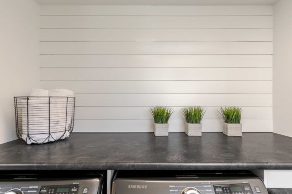 - Beautiful custom wood mantle and shelves against shiplap walls