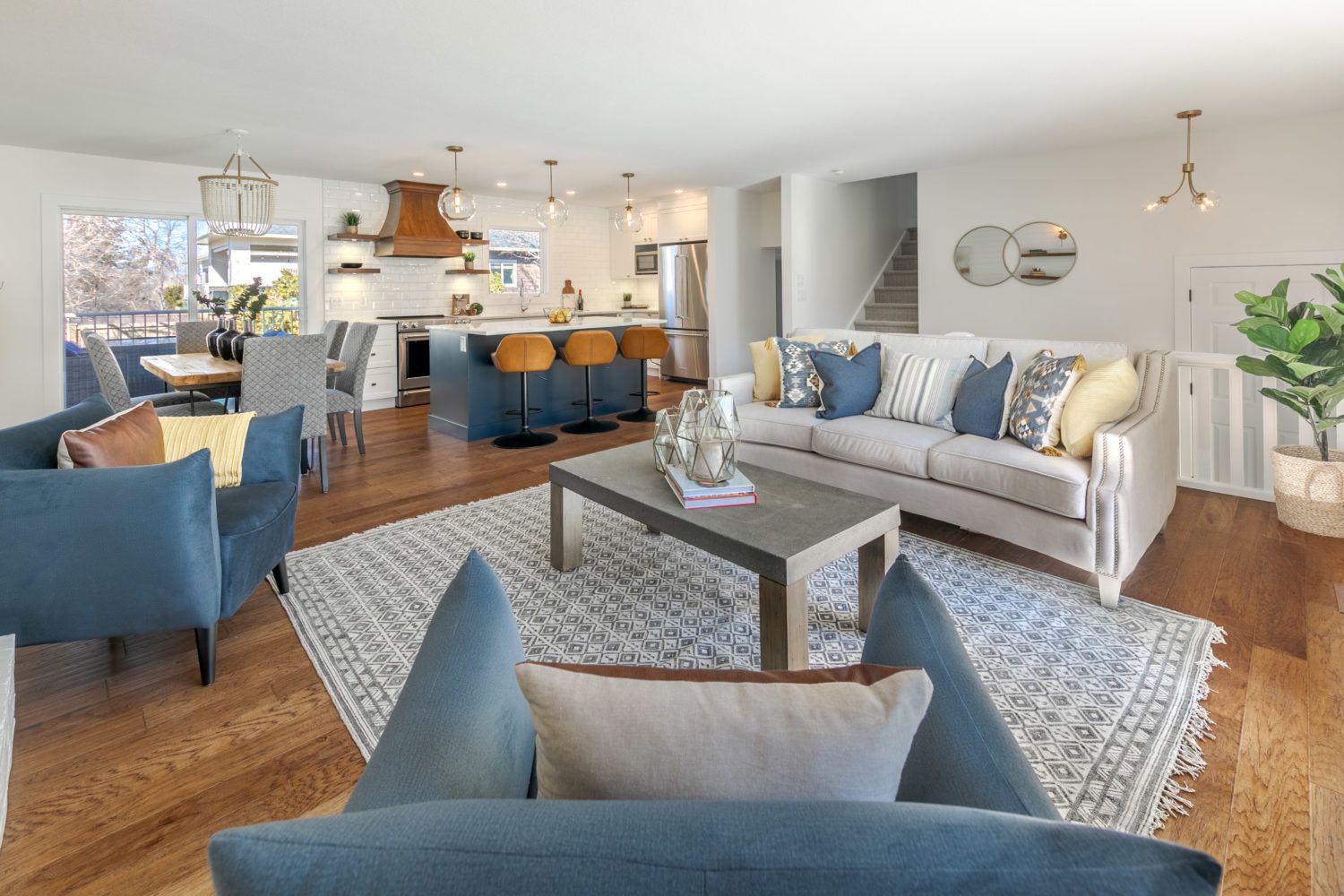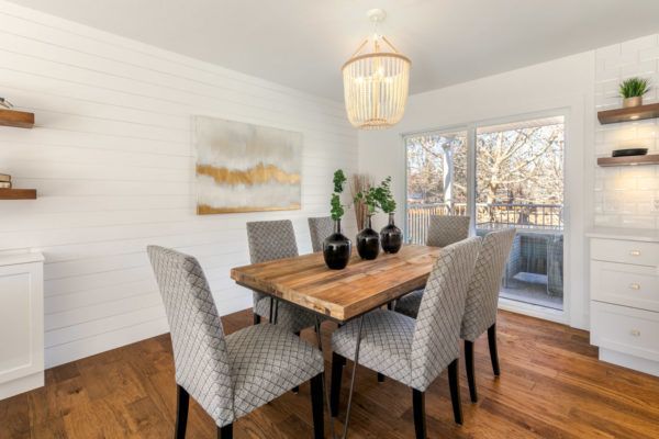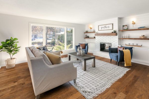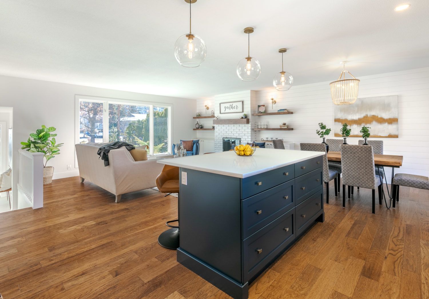 The main living space is an open concept that overlooks the front and back yard of the home. The bright living room features a classic wood-burning fireplace with a solid wood mantle and floating wood shelves against a white shiplap wall flowing into the dining area. The new kitchen with designer features: