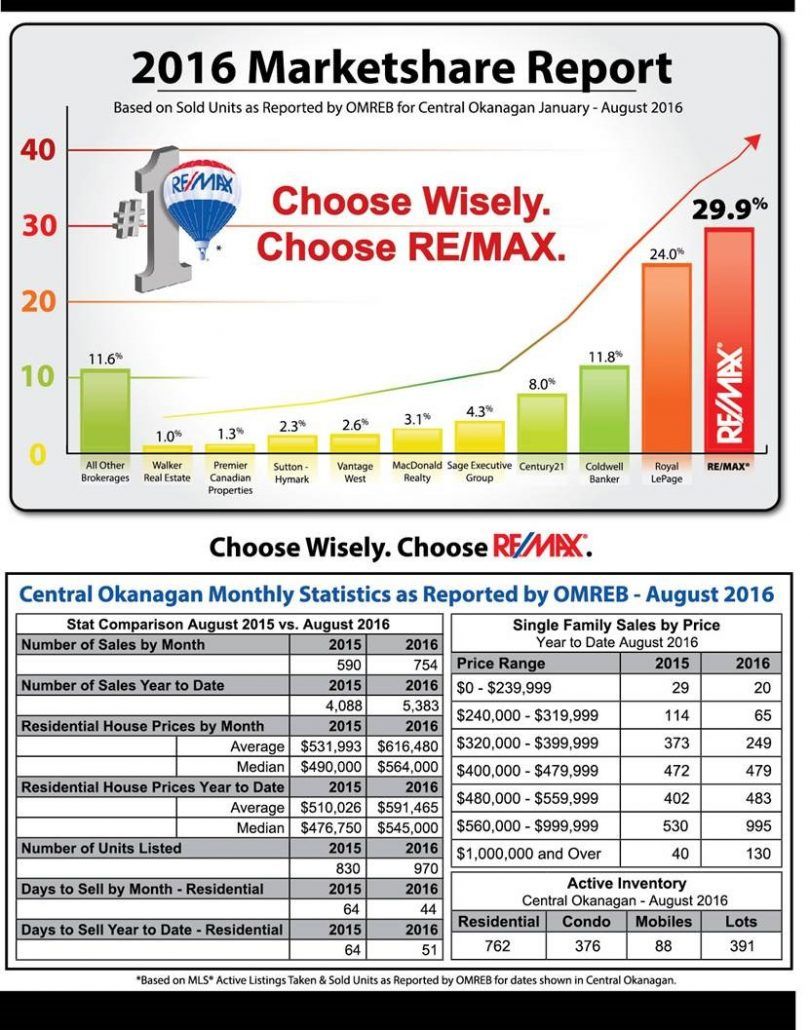 Central Okanagan Monthly Statistics as Reported by OMREB – August 2016.